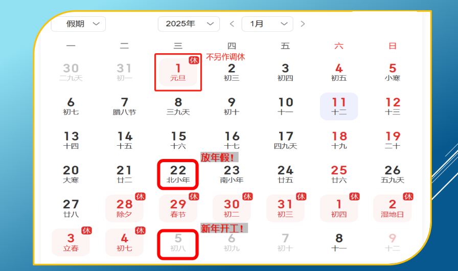 为了不耽误贵公司的正常业务和工作,现将我公司2025年元旦/春节放假的时间安排通知您,以便您提前安排相关事宜。