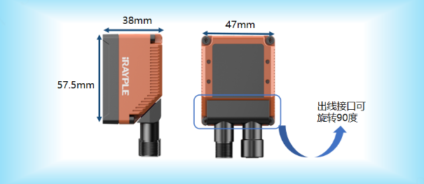 超紧凑的机身尺寸57.5*47*38mm,尺寸小巧可安装在各种狭小的空间;出线接口可旋转、便于灵活布线。