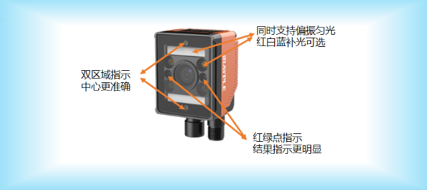 读码区域指示采用两个指示灯,可准确指示视野中心区域;读码结果采用双色指示,更容易识别和区分;同时支持多种焦距镜头和偏振匀光,补光更为灵活有效。
