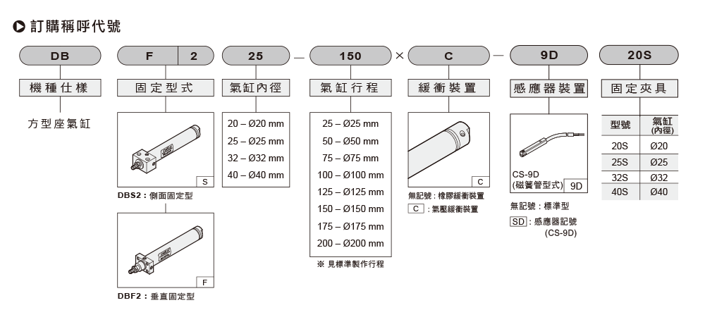 缸径:Ø20、Ø25、Ø32、Ø40,机种形式:侧面固定型、垂直固定型,行程:25~300mm。