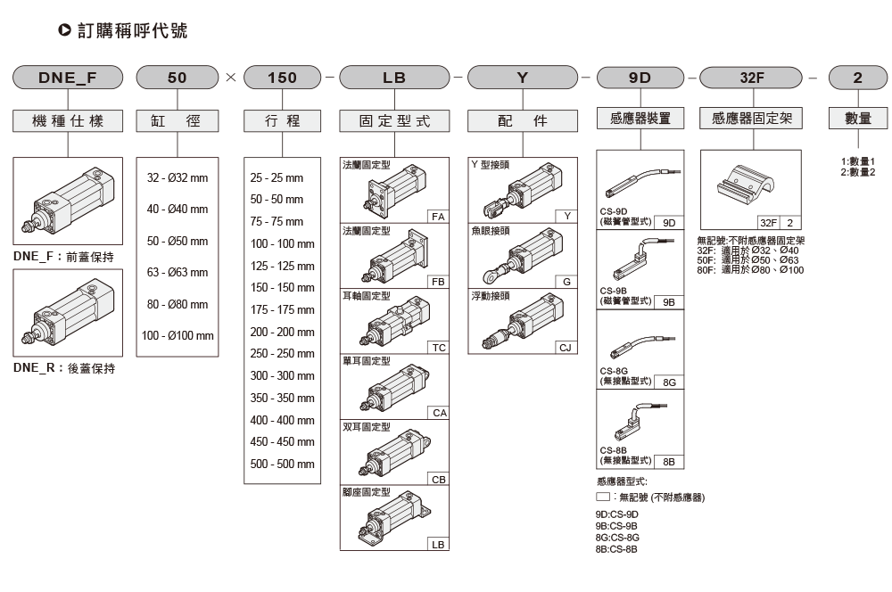 缸径:Ø32丶Ø40丶Ø50丶Ø63丶Ø80丶Ø100。