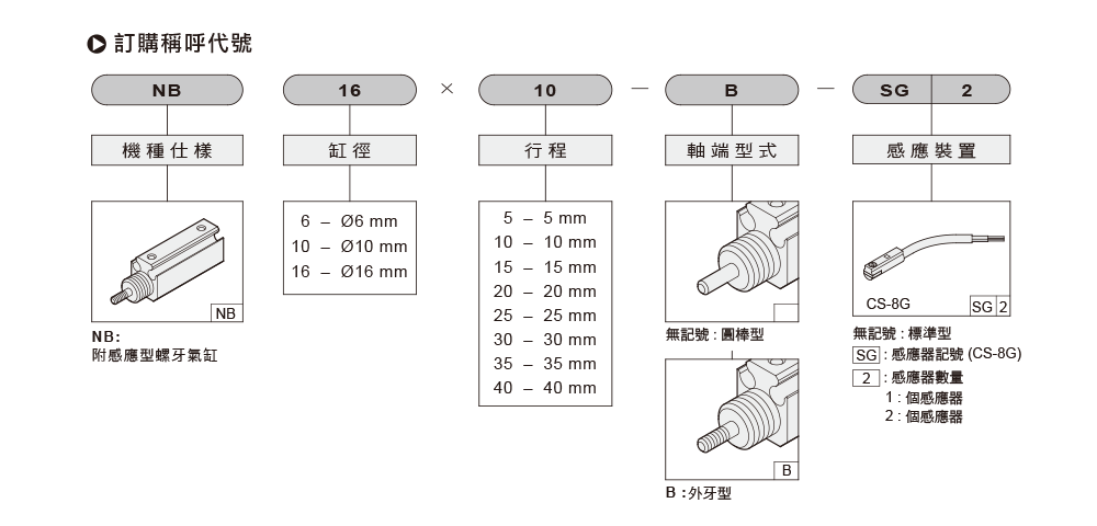 缸径: Ø6, Ø10, Ø16; 作动形式: 複动。