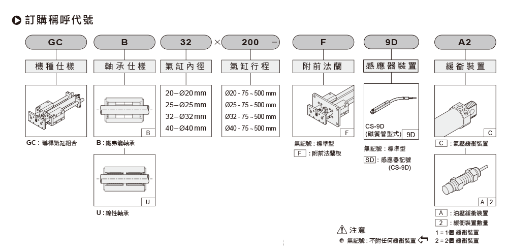缸径 : Ø20~Ø40;作动形式 : 复动型;行程 : 75~500mm。