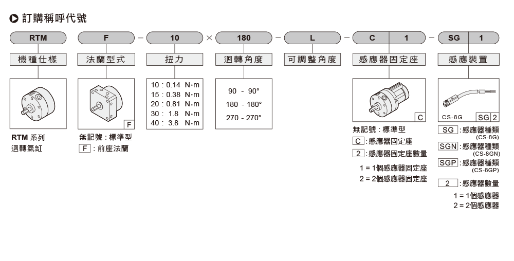 规格:10~100;作动形式:复动型;回转角度:90°、180°、270°。