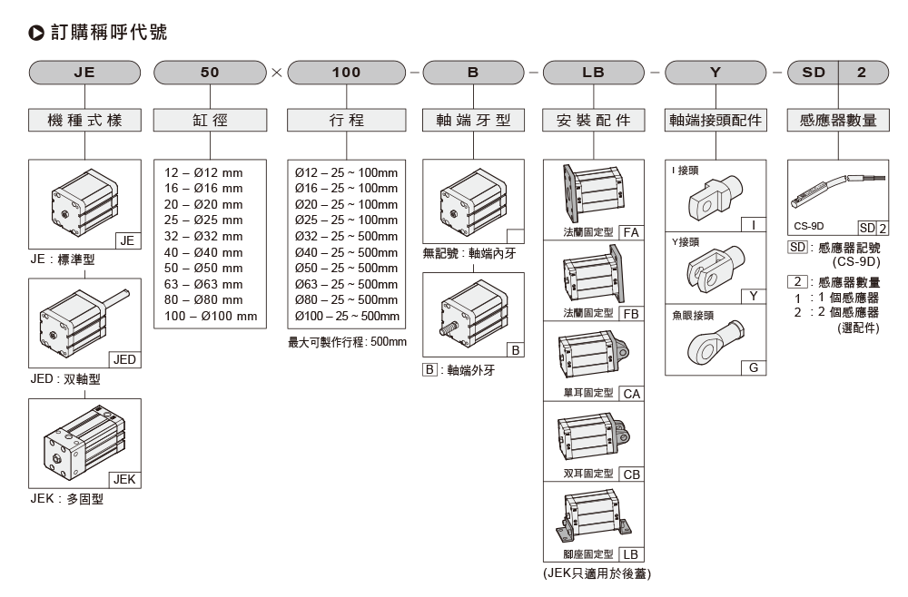 缸径:Ø12~Ø100,机种形式:标准型、双轴型、多固型,行程:25~500mm。