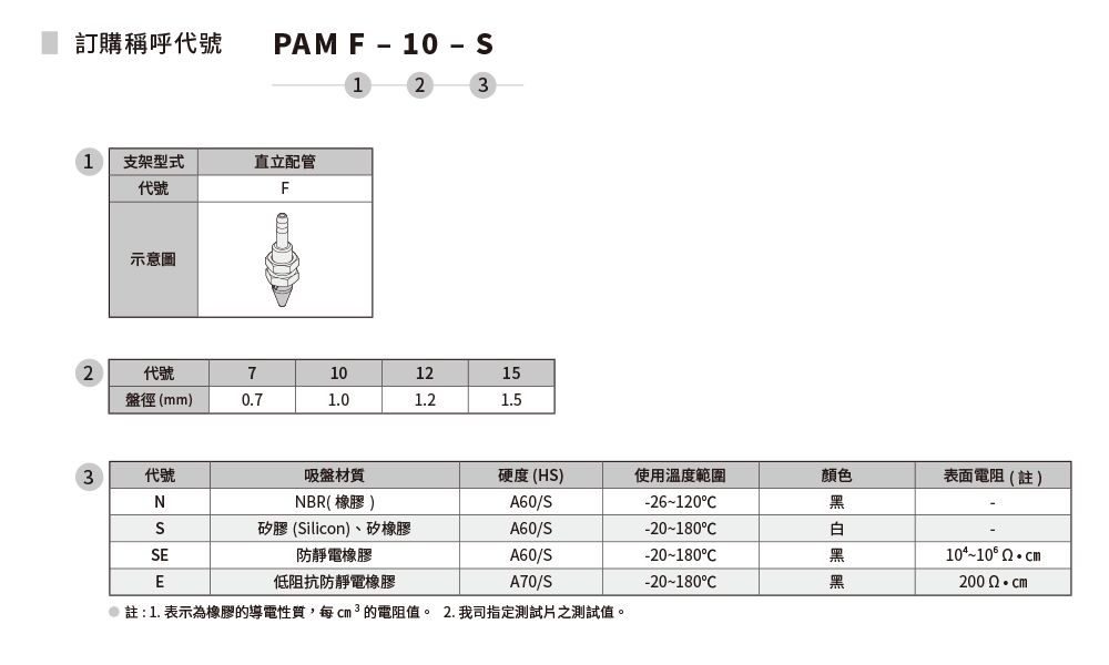 1.多吸盘材质选择,因应不同物件表面。 2.适用于小型零件(电子零件)等吸着。 3.多吸盘口径选择,因应不同物件尺寸需求。
