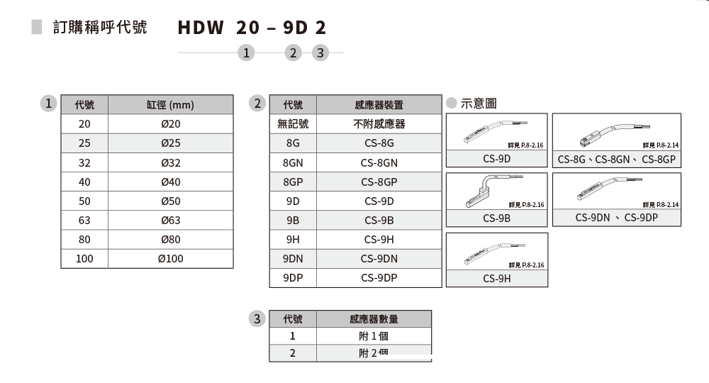缸径:Ø20~Ø100;作动形式:複动型;开闭尺寸:8~60mm。