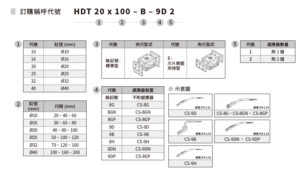缸径:Ø10~Ø40;作动形式:复动型;开闭尺寸:20~200mm。