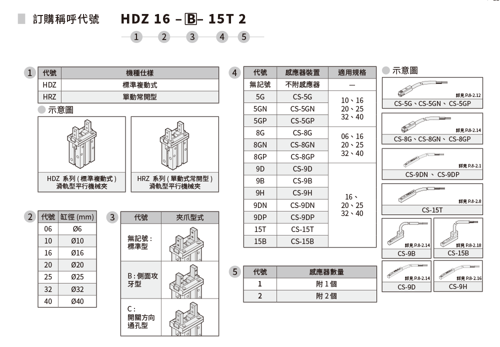 缸径:Ø6~Ø40;作动形式:单动型、复动型;开闭尺寸:4~30mm。
